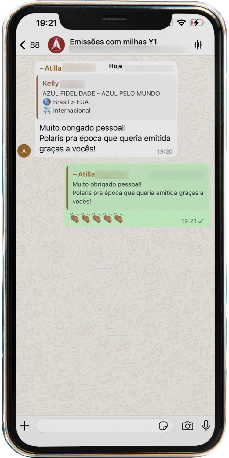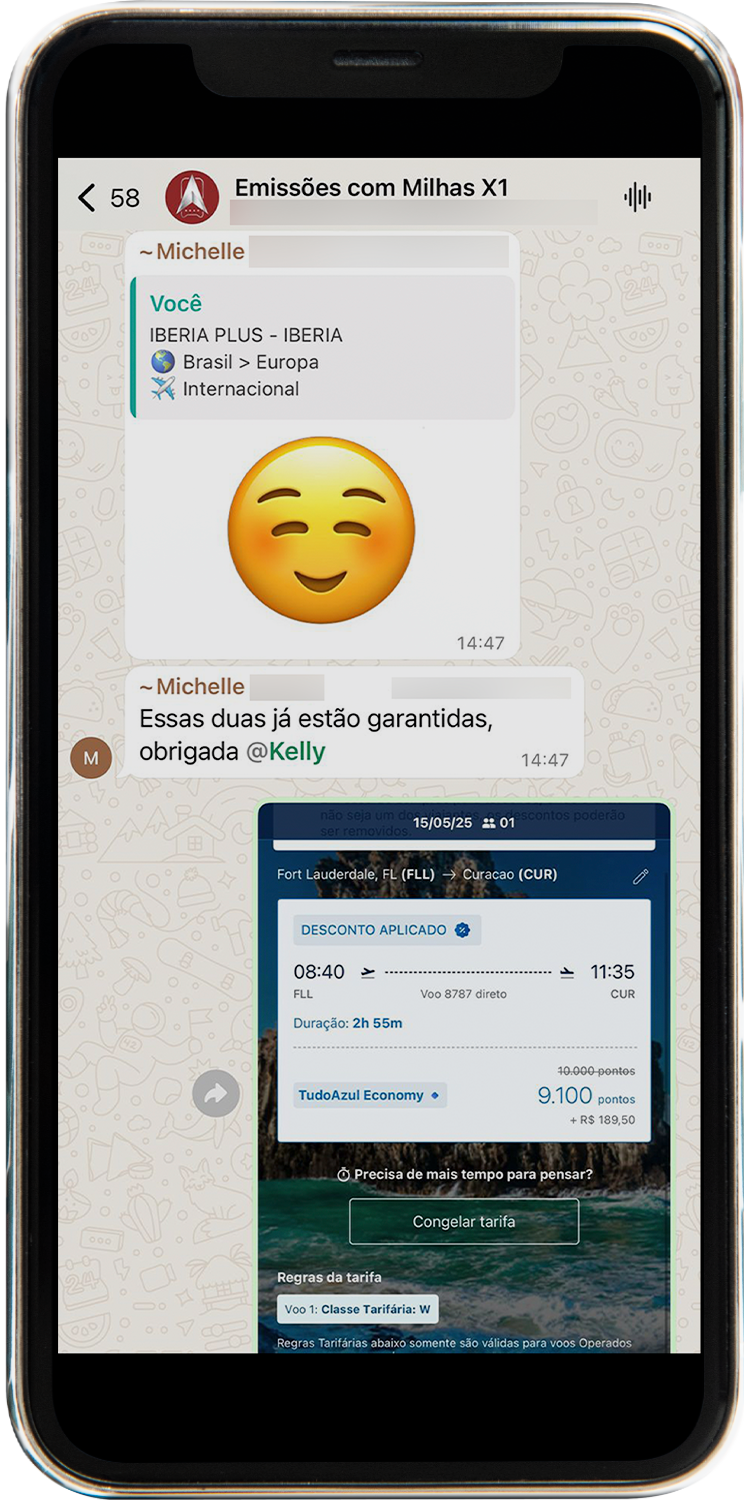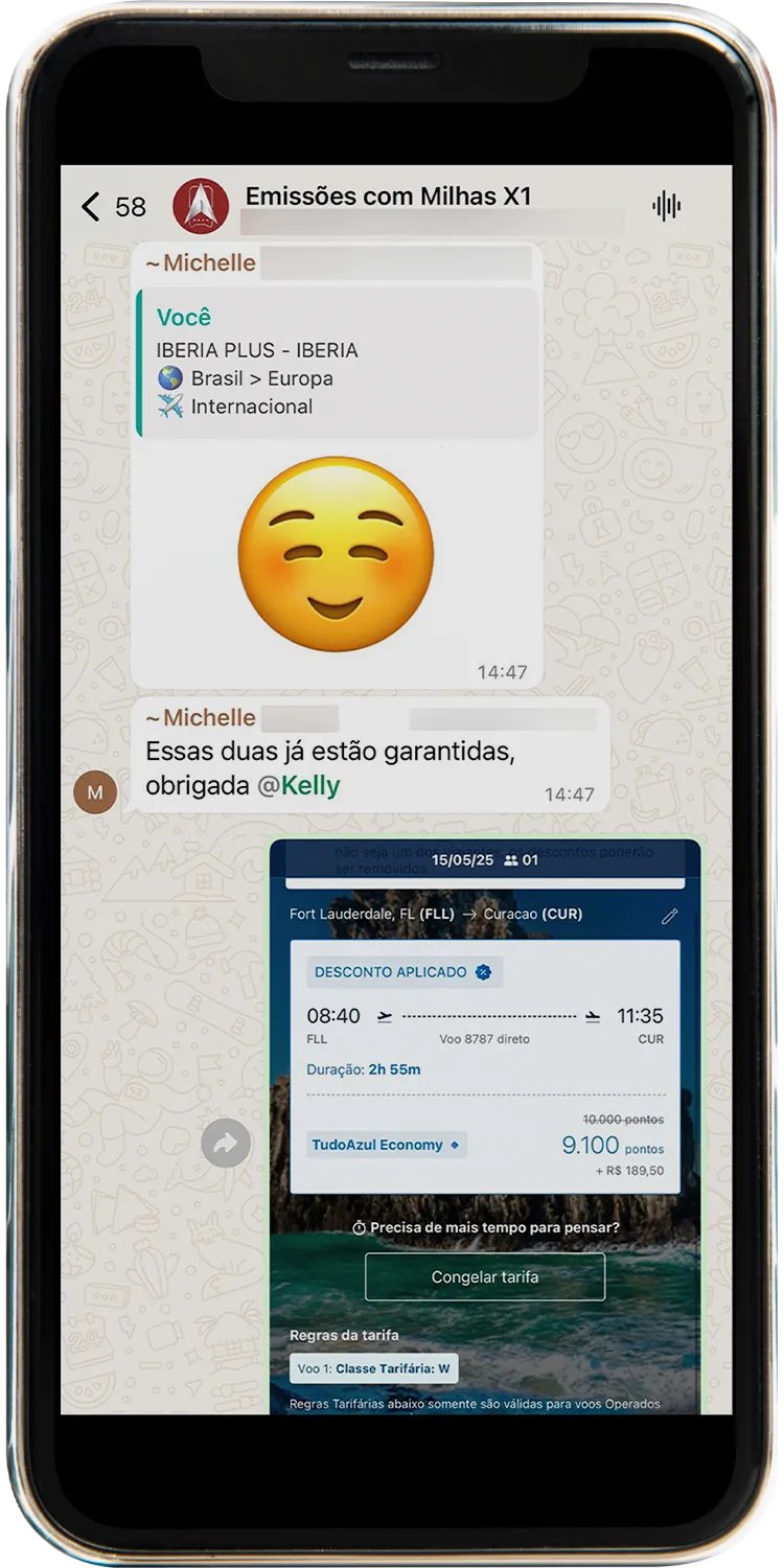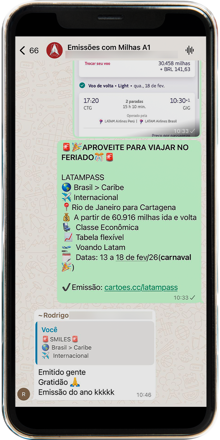 Todos os alertas são enviados diretamente em um grupo exclusivo no WhatsApp. Assim que surgem novas oportunidades, você recebe uma mensagem com todos os detalhes da emissão, como rota, datas, quantidade de milhas e instruções para emitir a passagem. Tudo chega pronto, sem que você precise ficar procurando.